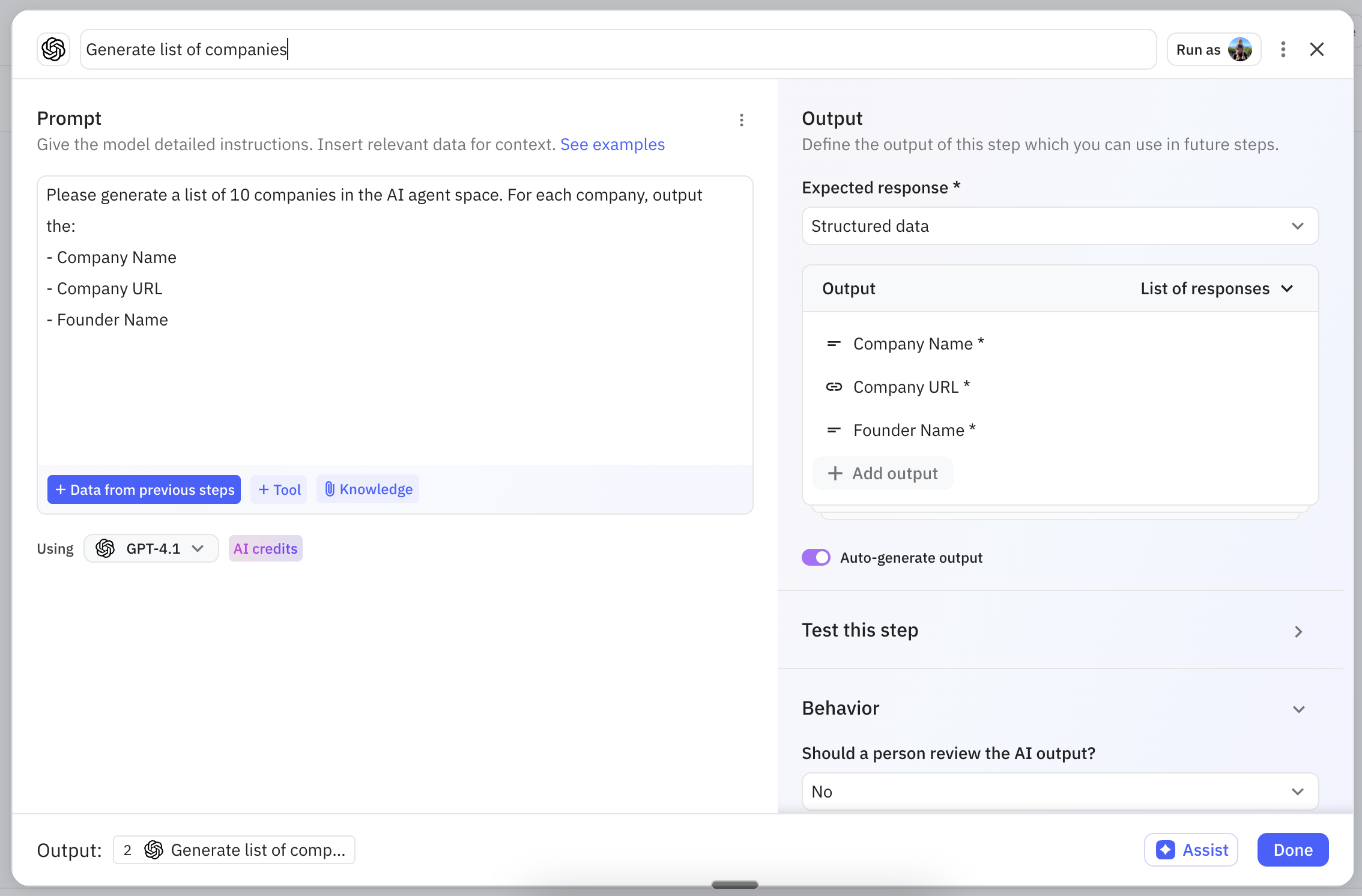 <figure><img src="https://647519108-files.gitbook.io/~/files/v0/b/gitbook-x-prod.appspot.com/o/spaces%2FXkKoEy3xMIYaIwd4mRAB%2Fuploads%2Fgit-blob-9617e4304fe0d6ed6a8b5e9512d6e138c27c1693%2FScreenshot%202025-06-18%20at%208.06.19%E2%80%AFPM.png?alt=media" alt=""><figcaption><p>AI step to produce a list of companies with key information about each.</p></figcaption></figure>