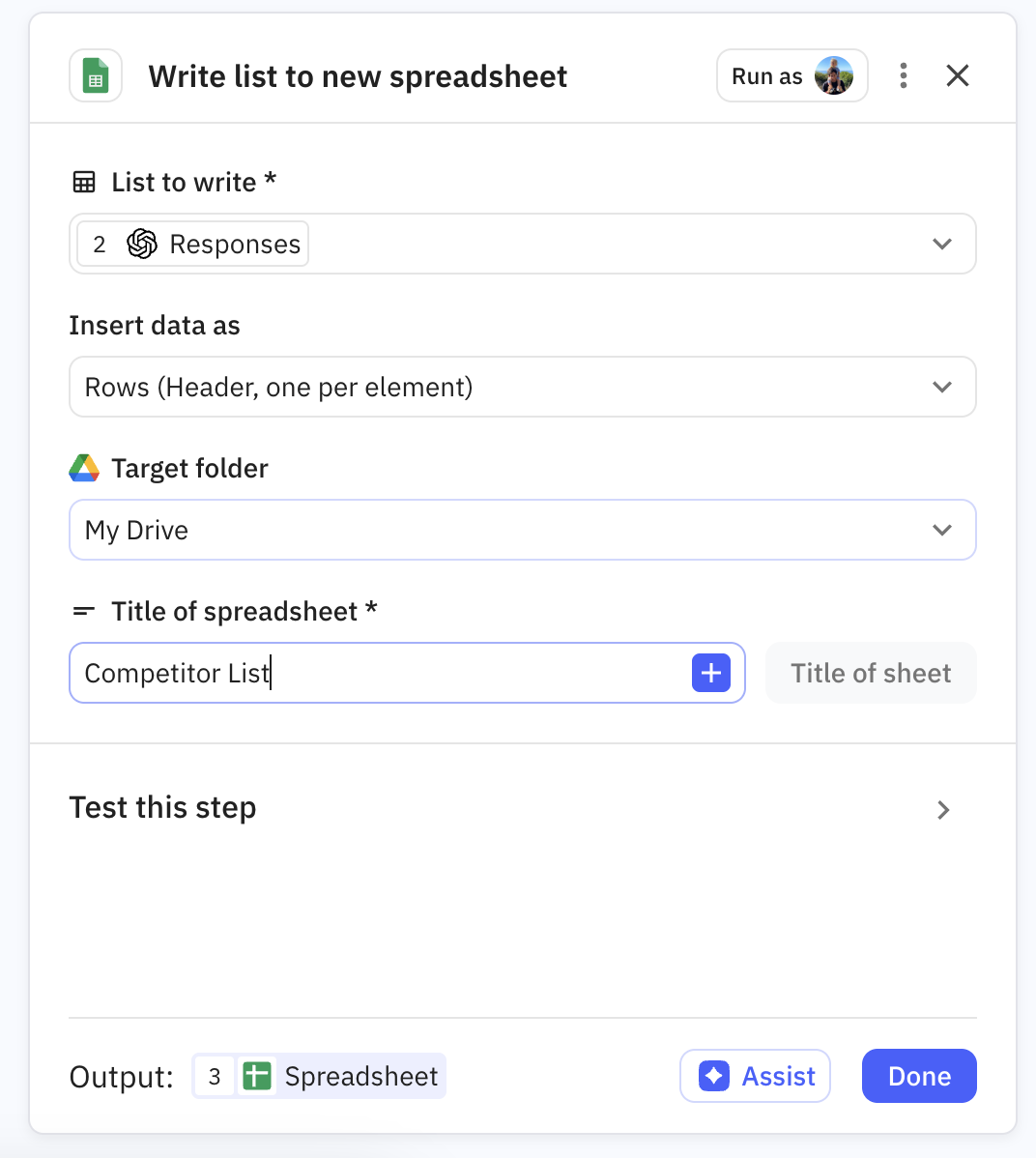 For example, suppose you have an AI step that produces a list of items, and for each item it includes a company name and website URL, and you want to create a complete spreadsheet with that information.