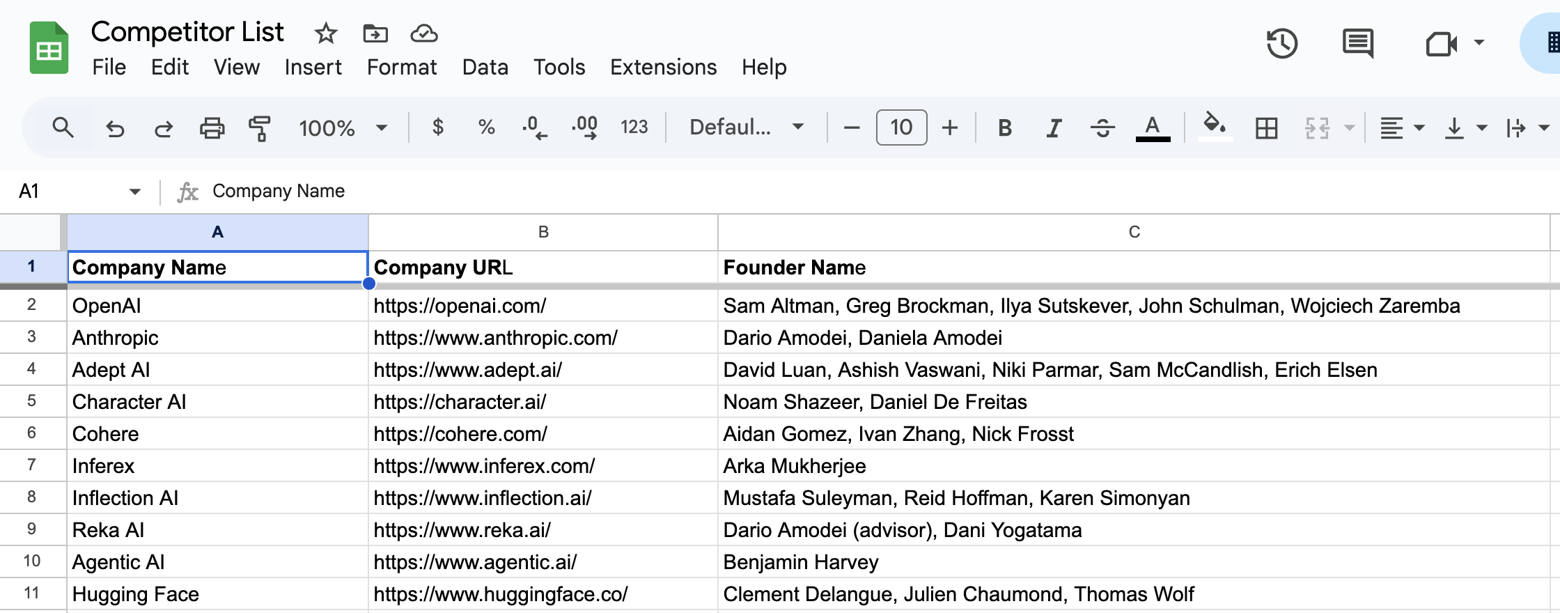 Here's a simple example workflow that generates a list of competitors in a spreadsheet: