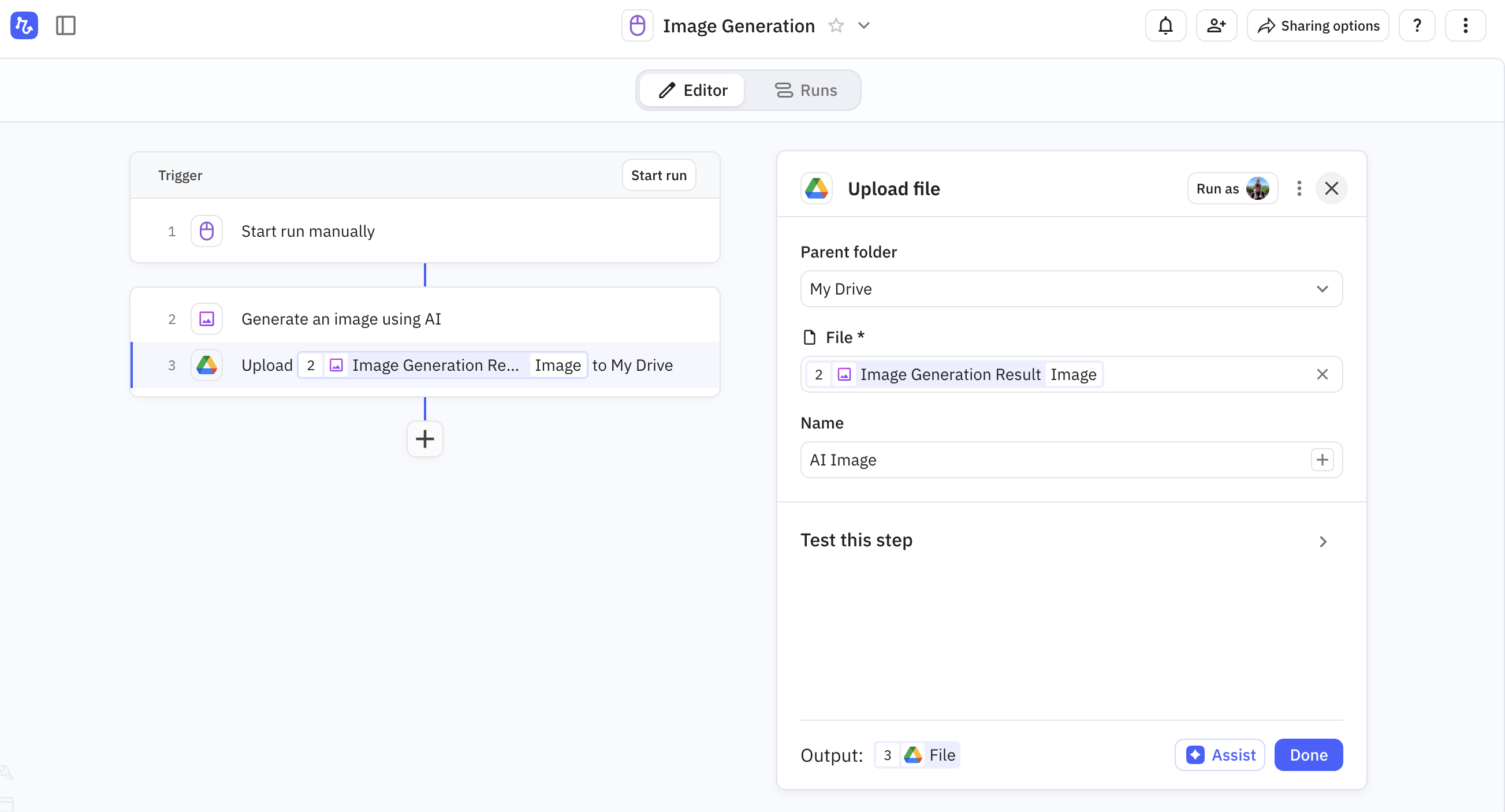 After your 'Generate an Image' step, you'll get a Step Output (more on that in [step-outputs](https://docs.relay.app/data/step-outputs "mention")) that is an image file. You can use that in subsequent steps, for example to upload the image to Google Drive or post the image on LinkedIn.
