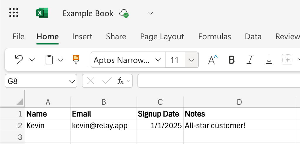 As Microsoft Excel doesn't have native types for columns, Relay.app infers the data type for each column based on a combination of the header names of that column and the values in the row under the header.
