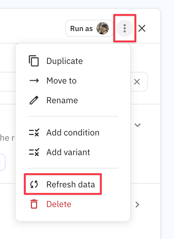 <div align="left"><figure><img src="https://647519108-files.gitbook.io/~/files/v0/b/gitbook-x-prod.appspot.com/o/spaces%2FXkKoEy3xMIYaIwd4mRAB%2Fuploads%2Fgit-blob-e6260ed4bed4c1f21a1247cdc273fac7870c87db%2FCleanShot%202025-09-05%20at%2012.49.29%402x.png?alt=media" alt="" width="284"><figcaption><p>Generic way to refresh columns/data: click 'Refresh data' in the overflow menu of a Step</p></figcaption></figure></div>