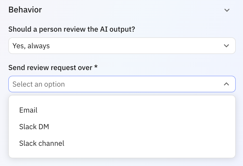 In the **Behavior** section of every AI step, there's a question '**Should a person review the AI output?**' that lets you (conditionally) turn on Human-in-the-Loop AI output reviews.