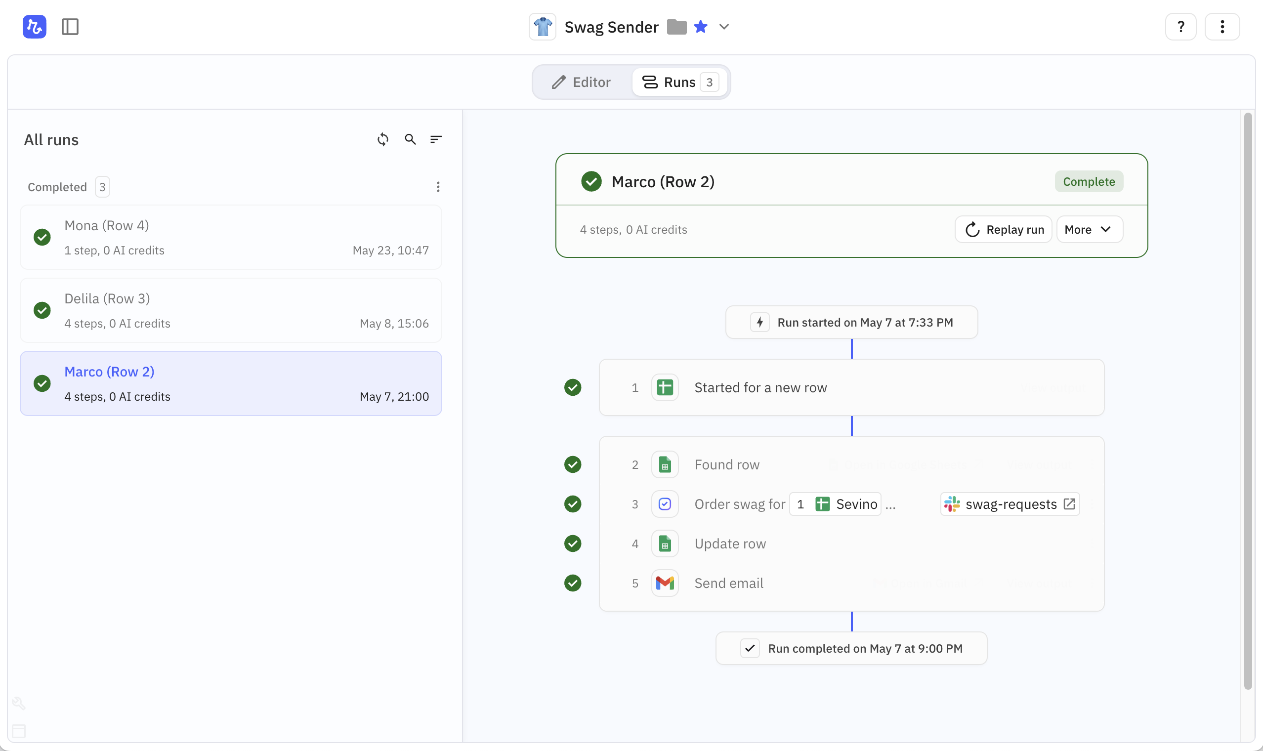 If you're still validating your workflow, click `Start a test run` in the `Editor` tab to run your workflow all the way through. Test runs are the same as real runs, but you'll select existing data to use (e.g. an existing row in a spreadsheet) rather than waiting for a trigger.