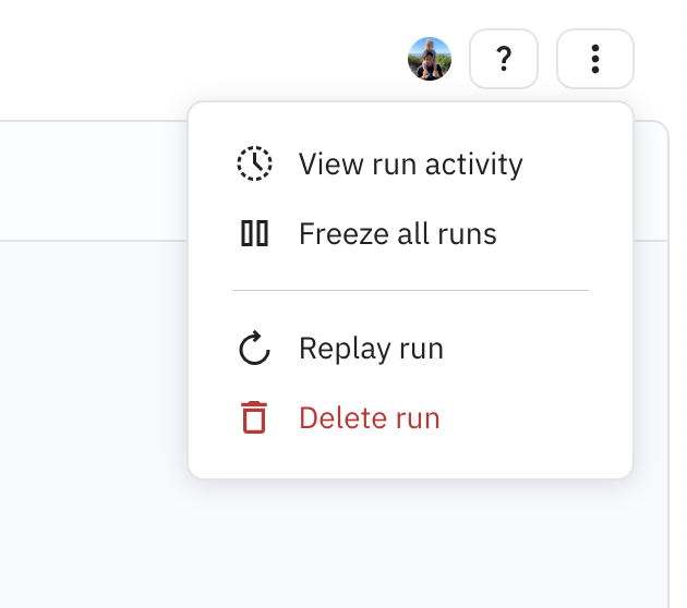 If you need to immediately stop the activity of a workflow, say because you have many active runs and you realize they all need to be stopped, look for the `Freeze all runs` button in the top right menu of the workflow or any run.