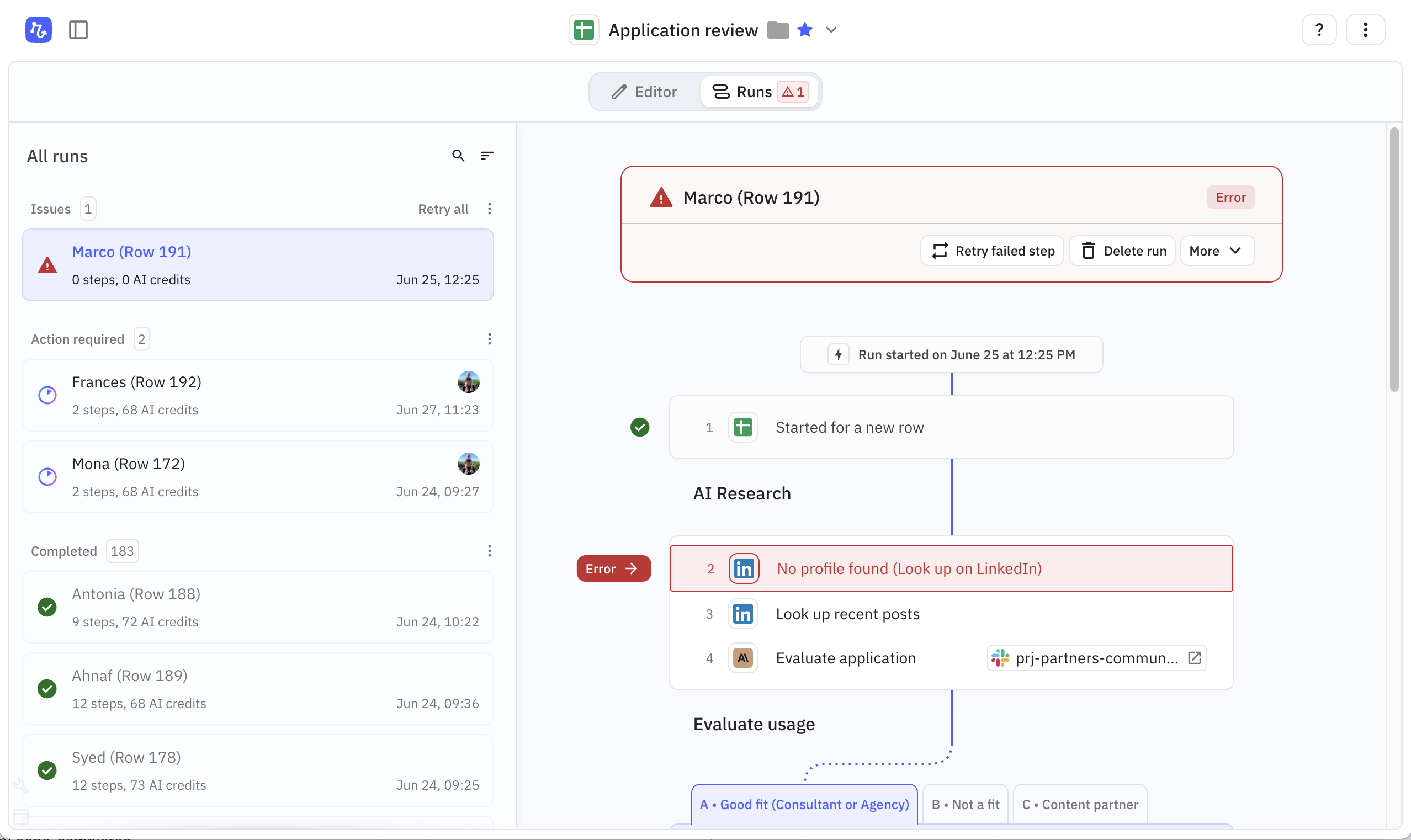 <figure><img src="https://647519108-files.gitbook.io/~/files/v0/b/gitbook-x-prod.appspot.com/o/spaces%2FXkKoEy3xMIYaIwd4mRAB%2Fuploads%2Fgit-blob-4a1a89b60c1cd392cdd9b81a4b032b0f633d34b2%2Fimage.png?alt=media" alt=""><figcaption><p>Run view with some runs in an error state, waiting for human action, and completed.</p></figcaption></figure>