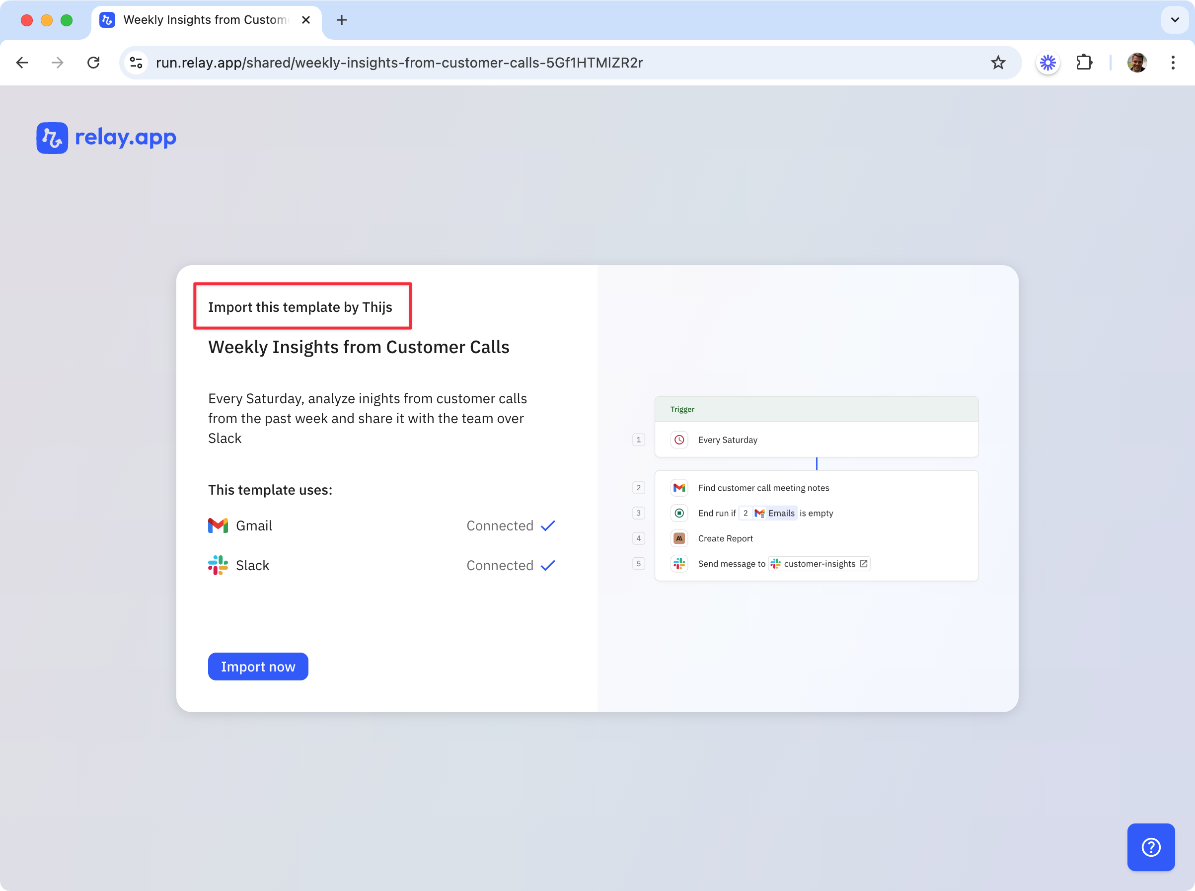 Learn more about [using/importing templates](https://docs.relay.app/templates/using-a-template-importing) or [creating templates yourself](https://docs.relay.app/templates/creating-a-template-exporting).
