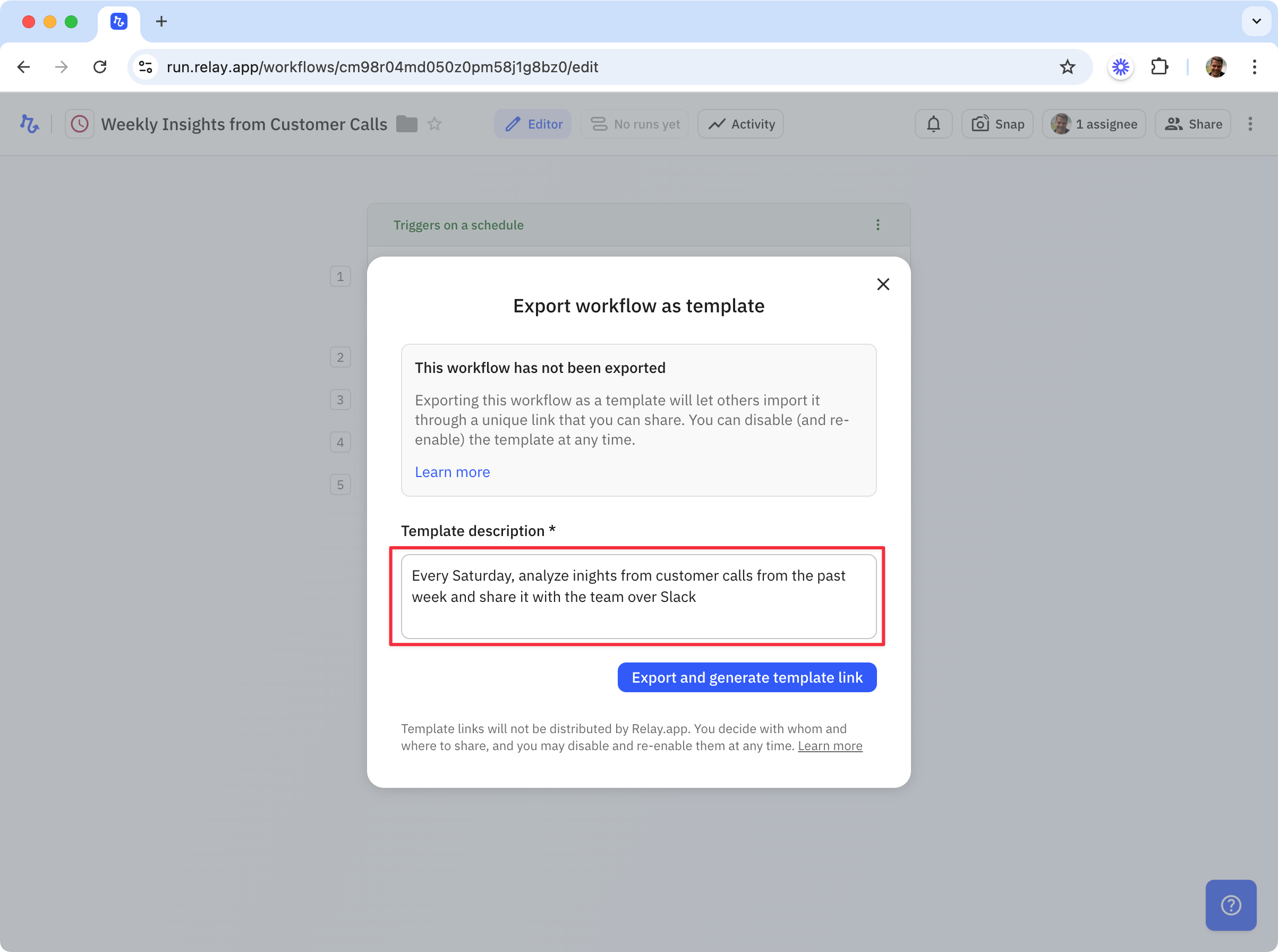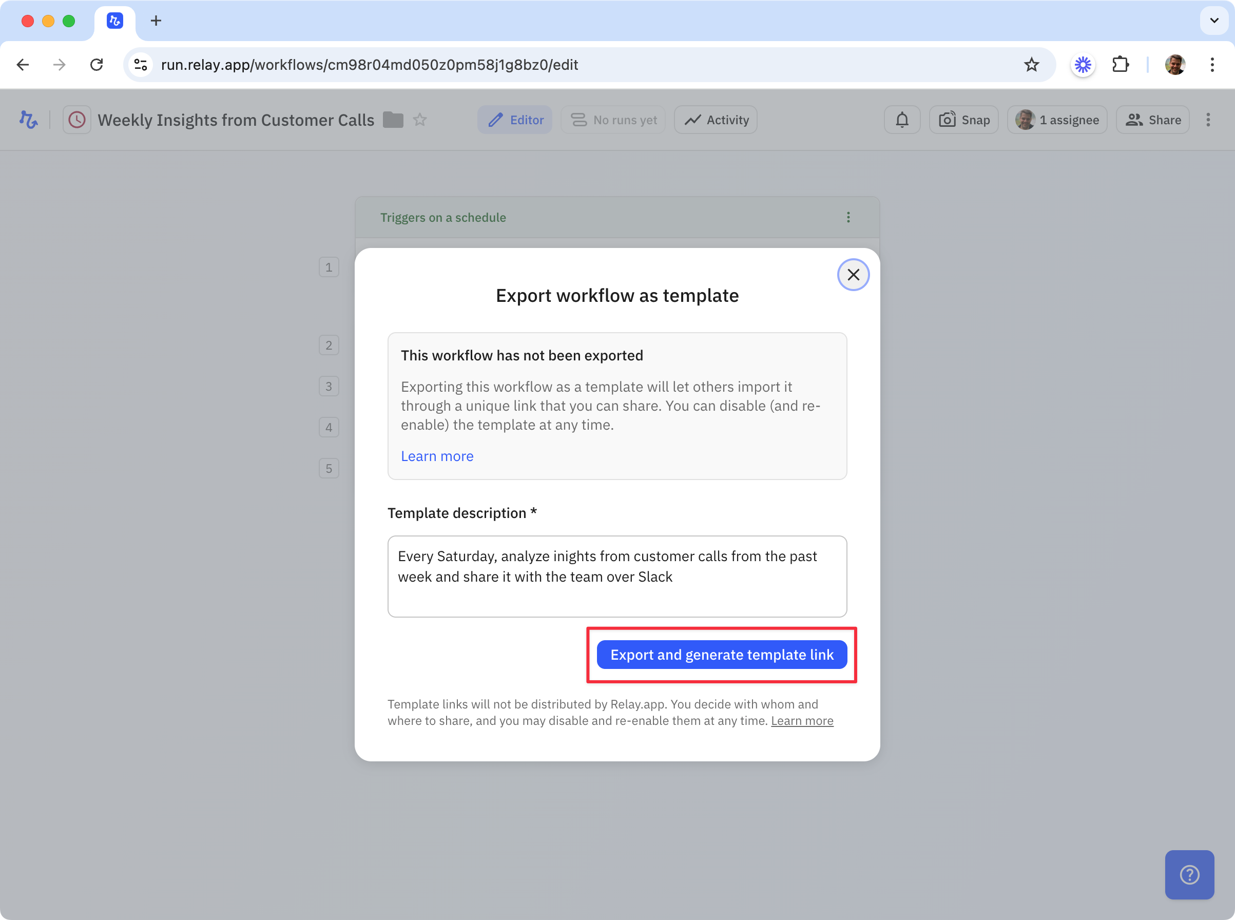 Click '**Export and generate template link**' to generate a unique template link for this workflow.