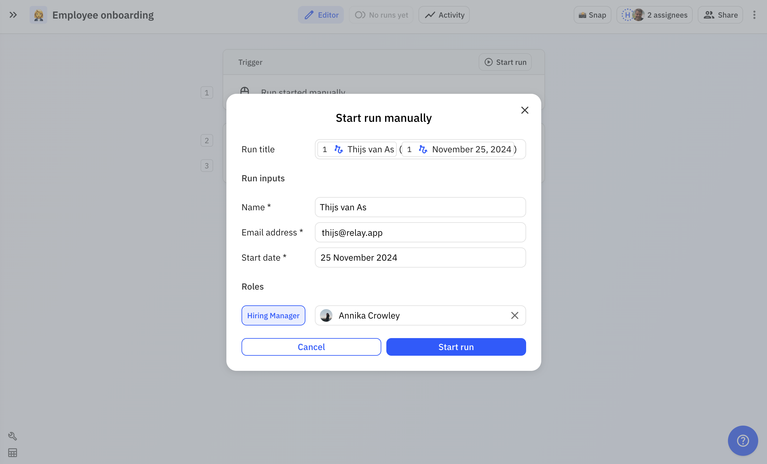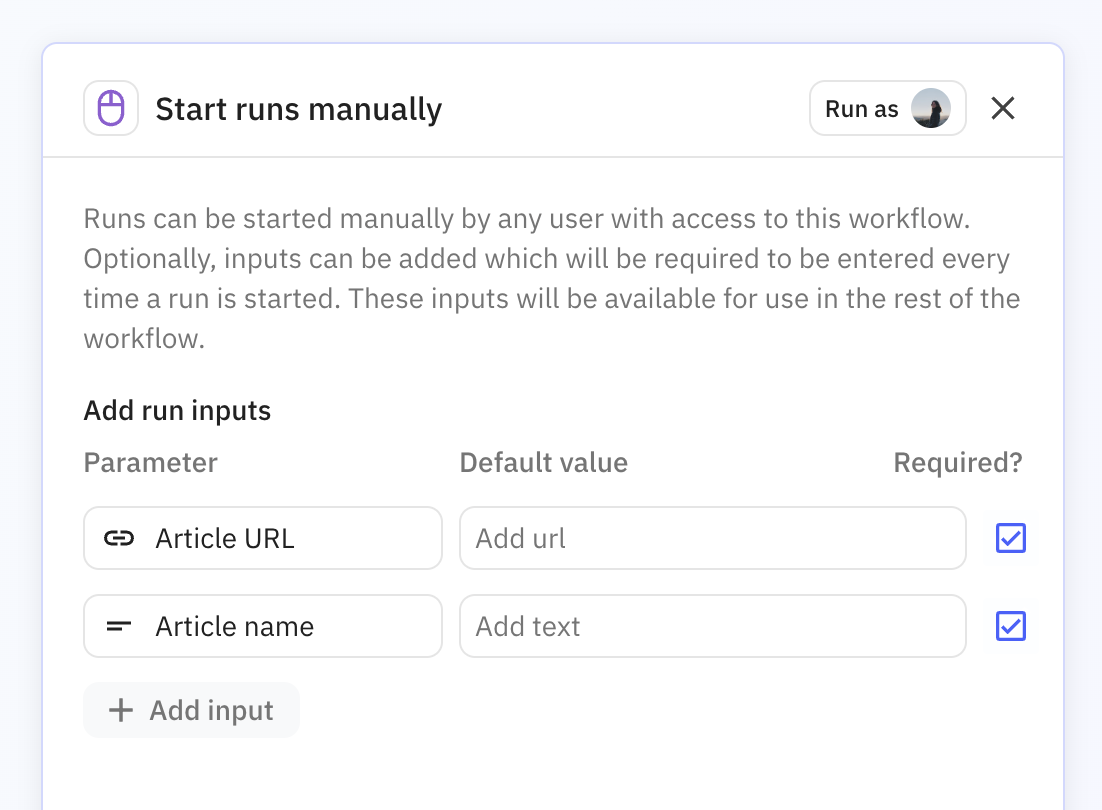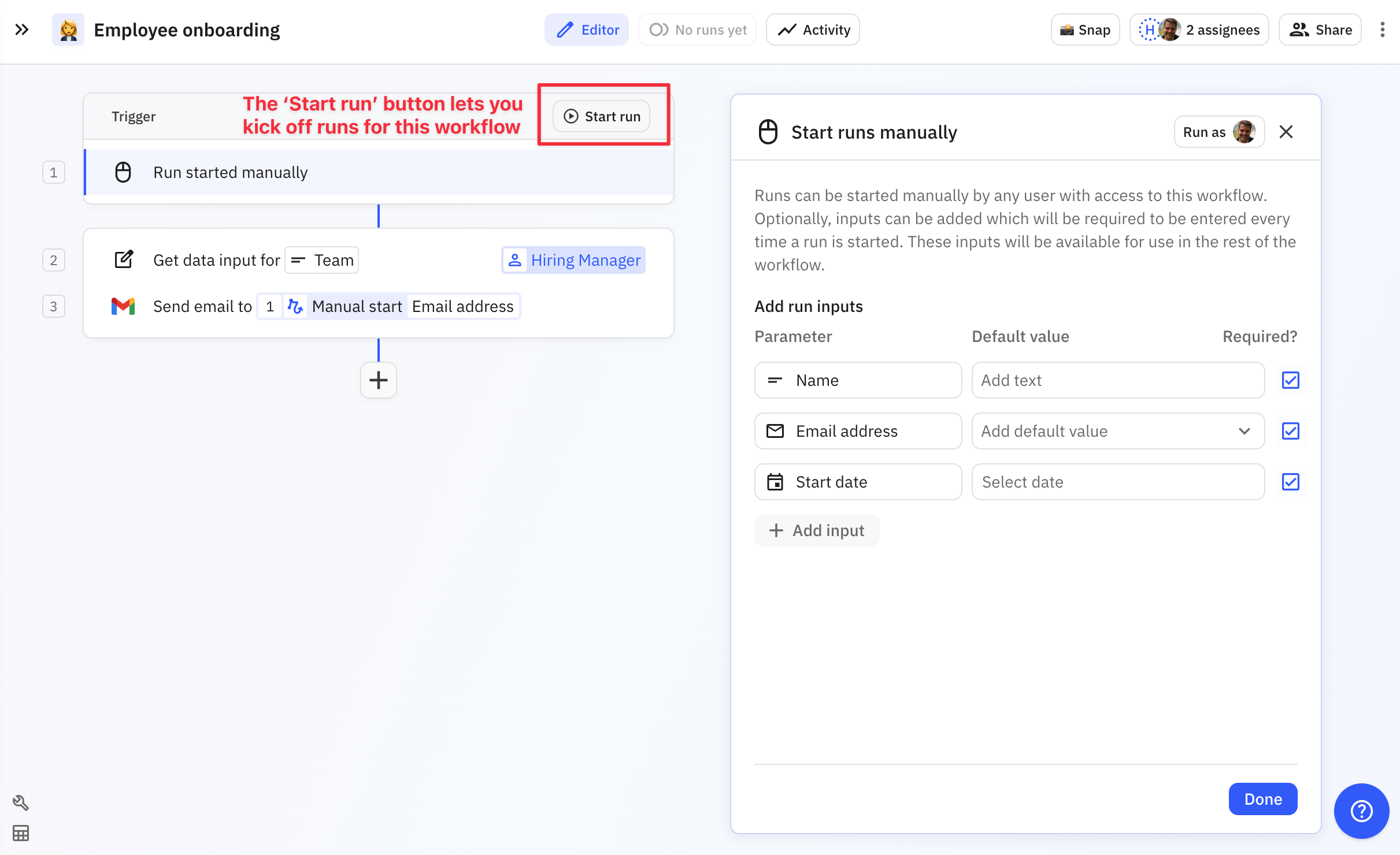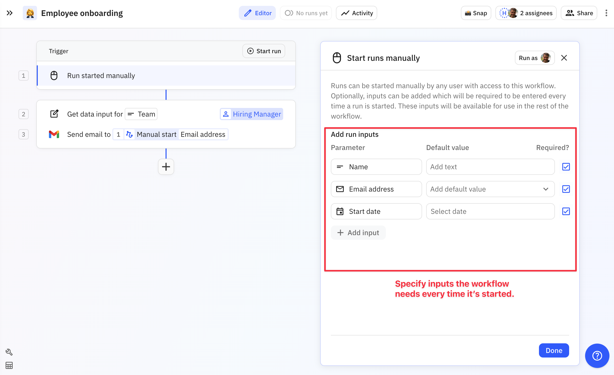 If your workflow requires inputs, when you start it manually you'll be asked to input the requested data. Fill it in and click **Start run**.