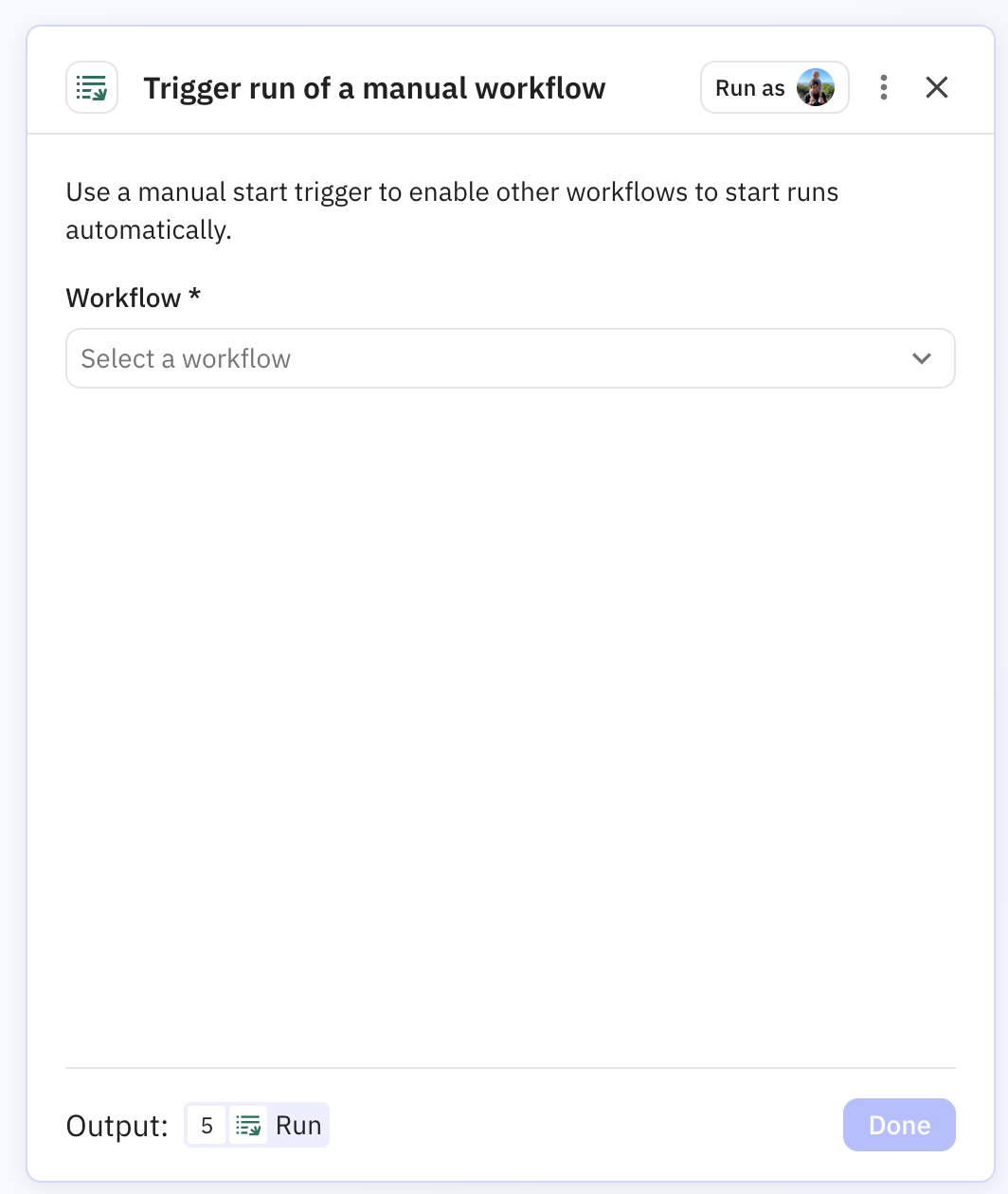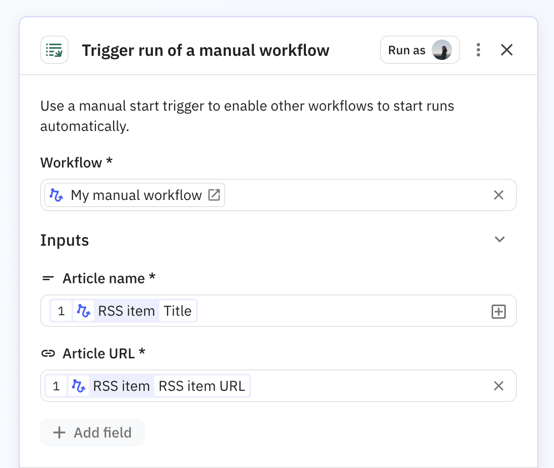 In addition to starting runs manually with a click, you can also call a manual workflow from another workflow and pass data between them.