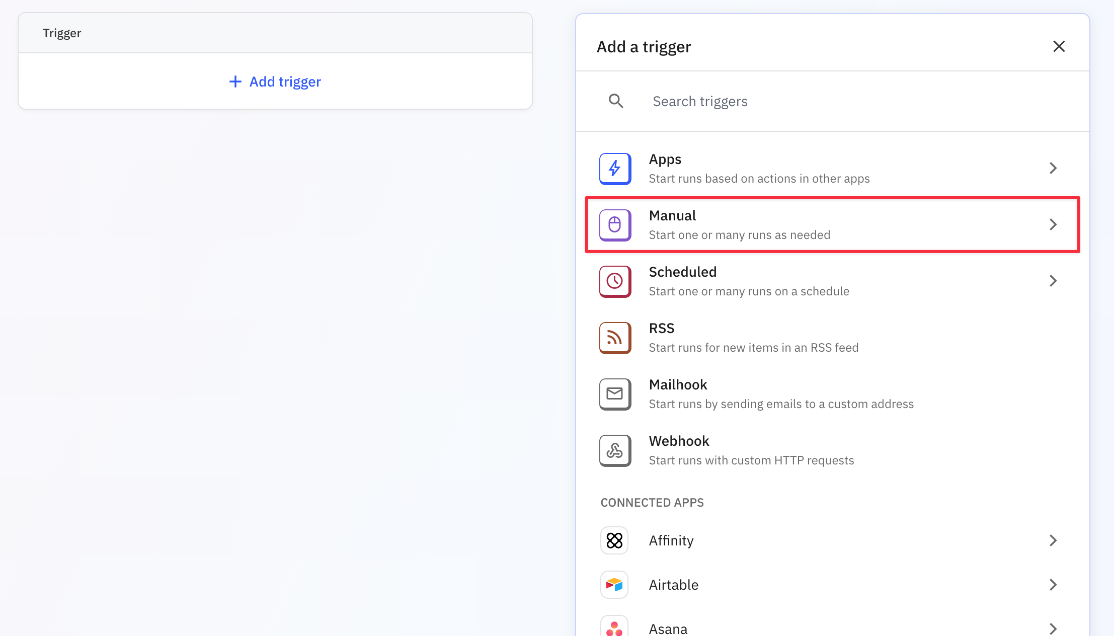 <figure><img src="https://647519108-files.gitbook.io/~/files/v0/b/gitbook-x-prod.appspot.com/o/spaces%2FXkKoEy3xMIYaIwd4mRAB%2Fuploads%2Fgit-blob-7ad921565136c8c7d8f45d046e0ab15ca87320de%2FCleanShot%202024-11-21%20at%2012.41.58.png?alt=media" alt=""><figcaption><p>"Manual" trigger options in the trigger panel</p></figcaption></figure>