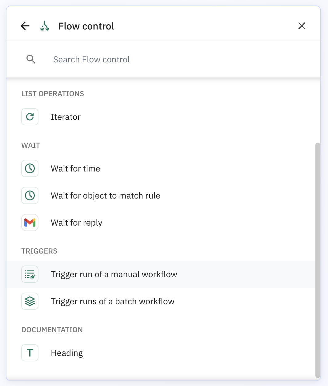 Open your primary workflow, add a new step, and under **Flow control** select **Trigger run of a manual workflow**.
