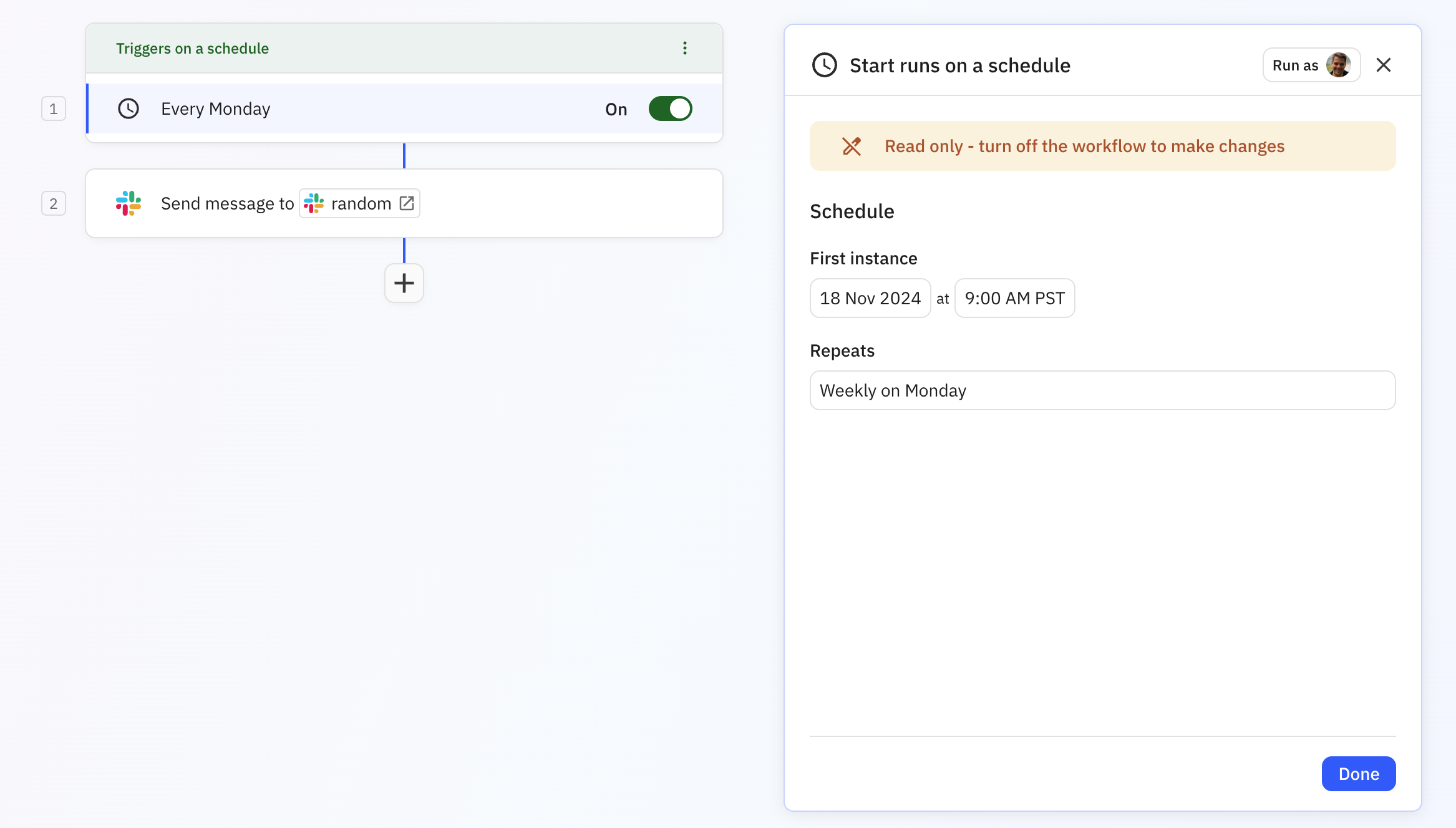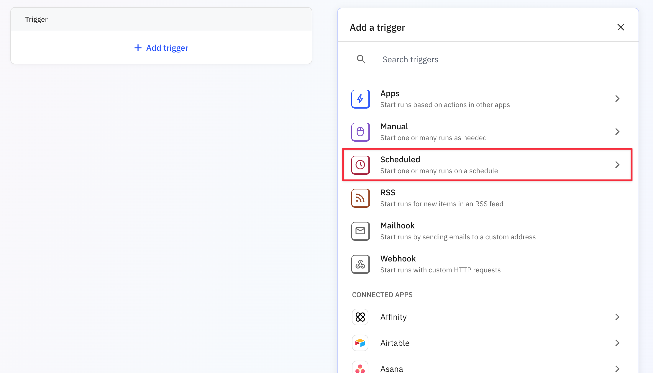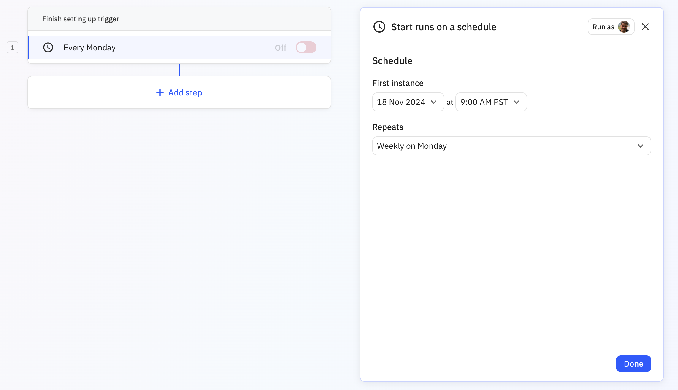 Scheduled Triggers let you define a custom schedule/frequency how often runs of a workflow should be triggered.