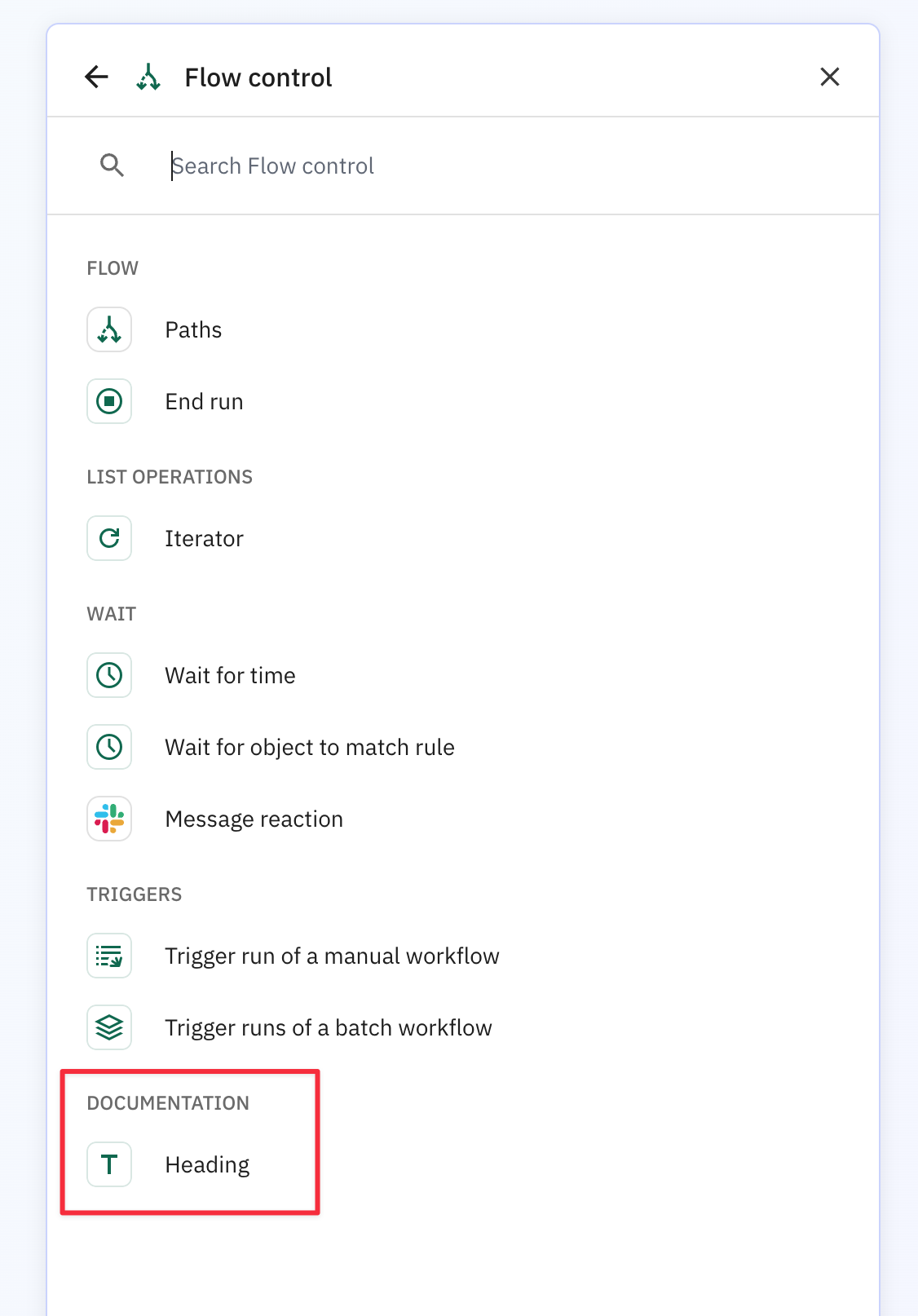Headings allow you to create descriptive section headers in your workflows. Headings don't change the functionality of your workflow, they're purely helpful for yourself and your team (e.g. as lightweight documentation).