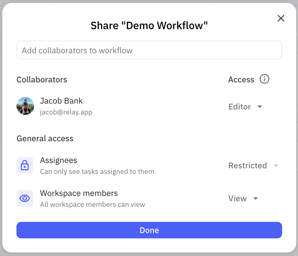 Each workflow has granular permissions that govern which users have which levels of access. If you're familiar with Google Docs, you'll find the sharing model in Relay.app to be familiar. To view and edit the sharing permissions for a given workflow, select the Share button in the top right.